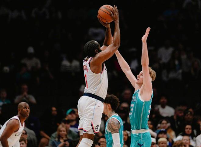 比赛一开始,黄蜂就摆出针对性防守,试图切断哈登与队友的联系,想让他陷入孤立无援的境地。但他们显然低估了这位老将的攻坚能力,哈登打满首节,面对单兵防守毫无惧色,出手果断且精准。12次出手命中9球,其中三分球7投5中,罚球6中4,单节狂揽27分,一人得分几乎追平黄蜂全队的30分,帮助快船以38-30抢占领先优势。这一节的哈登,仿佛回到火箭时期的巅峰,每一次突破、每一记三分都刀刀见血。
